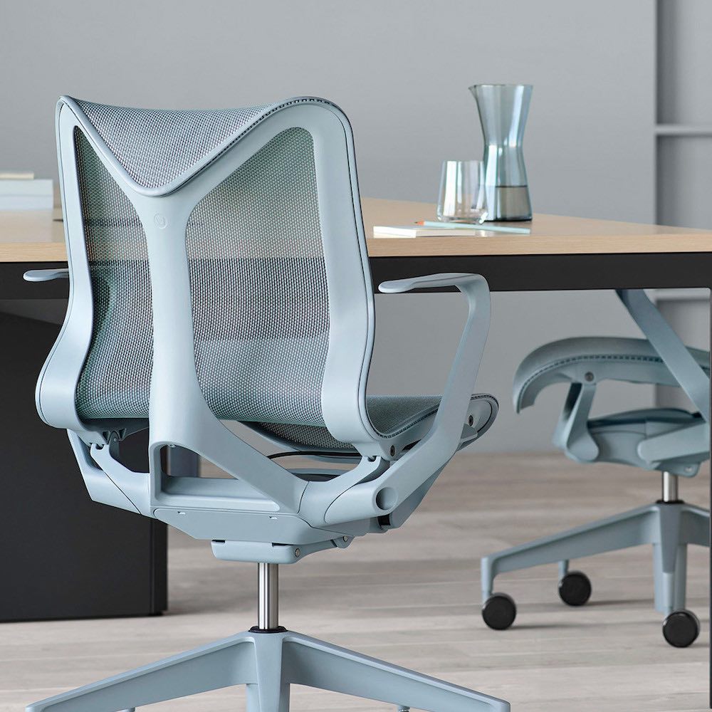 Bürodrehstühle müssen sich den Gegebenheiten anpassen. Für schnelle Meetings eignet sich der skulptural wirkende Cosm Chair von HermanMiller im besonderen, weil er gute Ergonomie mit kinderleichter Bedienbarkeit (gar keine Verstellhebel) vereint.