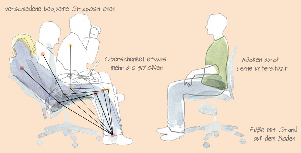 Ein guter Bürostuhl lässt dich während einer längeren Sitzung nicht unruhig umher rutschen, sondern unterstützt dich in deinem Bewegungsdrang. Ein solcher dynamischer Bürostuhl ist ab ca. 300€ zu haben – ein Preis, der sich auf lange Sicht für dich auszahlt, dich aber nicht vom regelmäßigen Aufstehen entbindet. Das Prinzip: Regelmäßig zwischen drei Sitzhaltungen wechseln. Der vorderen, der aufrechten und der hinteren Sitzhaltung.